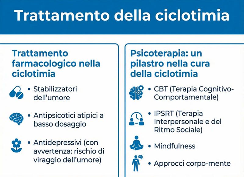 Nella ciclotimia, per contro, l’umore oscilla tra fasi sopra il proprio livello abituale e fasi sotto-soglia, con un andamento cronico: questo rende essenziale una diagnosi precisa, perché il trattamento della ciclotimia non coincide con quello della sola depressione.