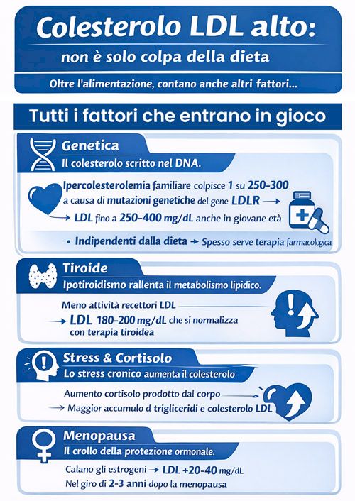 Queste persone producono troppo colesterolo endogeno indipendentemente dalla dieta, e la terapia farmacologica è quasi sempre necessaria. - Tiroide: il regista del metabolismo lipidico. L’ipotiroidismo rallenta il metabolismo dei grassi riducendo l’attività dei recettori LDL e la capacità del fegato di rimuovere il colesterolo. Pazienti con ipotiroidismo non trattato presentano spesso LDL superiori a 180-200 mg/dL, che si normalizzano rapidamente con la terapia sostitutiva tiroidea.